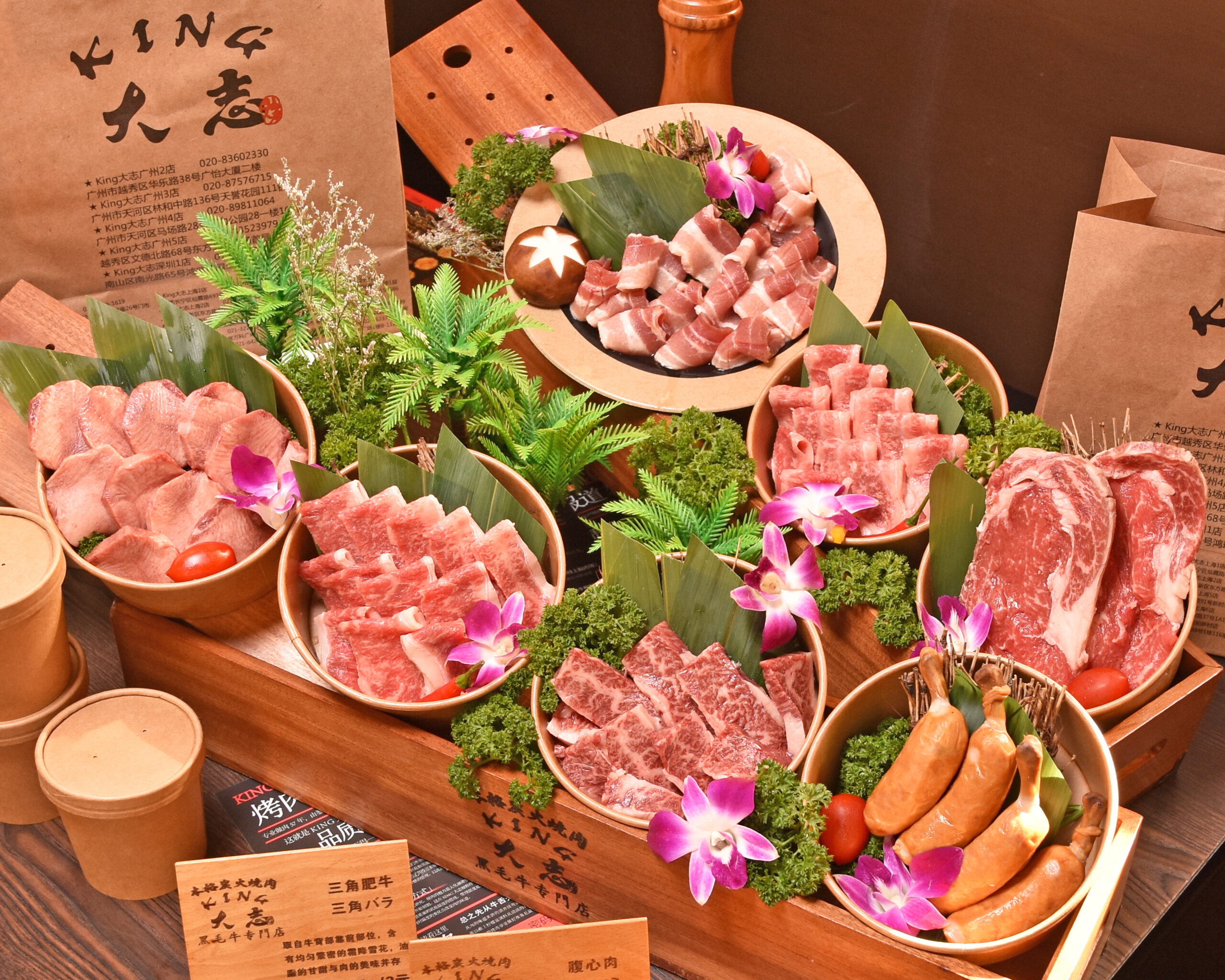 広州市天河区、林和中路の天誉花園にある本格炭火焼肉店「キング大志3号店」が6月21日(月)よりデリバリー専用「キング大志精選1㌔BBQセット」の販売を開始。価格は588元で「厚切り牛タン」、「黒毛牛バラ肉」、「厚切ハラミ」、「特上ロース」「黒豚豚バラ肉」、「骨付きソーセージ」、「キング大志特製焼肉ダレ」が付いてくる。